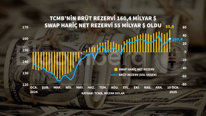 Swap hariç net rezervler ise 10 Ocak haftasında 55 milyar dolara yükseldi. Bir önceki hafta swap hariç net rezervler 46,7 milyar dolardı.
