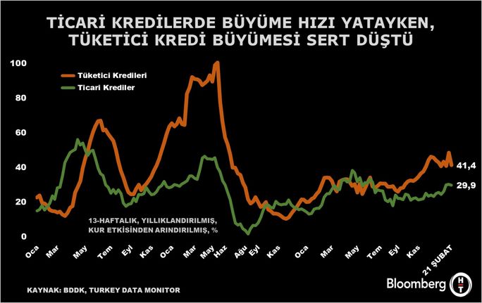 Ticari kredi ile tüketici kredi büyüme makası yaklaşık 10 düştü. Sert düşüş gösteren tüketici kredisi büyümesi 7,3 puanlık daralma ile yüzde 41,4 olarak kaydedildi.