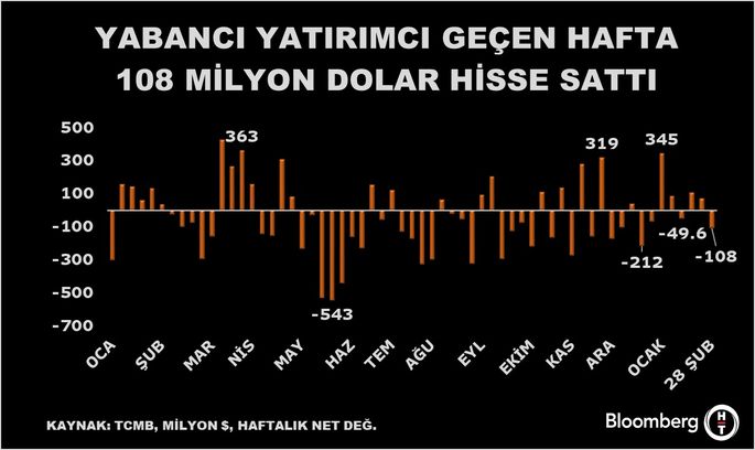 Yurt dışında yerleşik kişiler piyasa fiyatı ve kur hareketlerinden arındırılmış verilerle 28 Şubat haftasında 107,7 milyon dolar net hisse satışı yaptı.