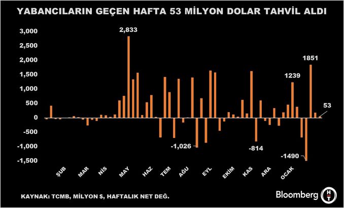 Türkiye Cumhuriyet Merkez Bankası(TCMB) tarafından açıklanan verilere göre, aynı hafta DİBS (Kesin Alım) net alımları 53,5 milyon dolar oldu.