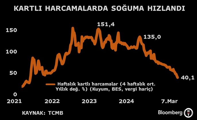 Kartlı harcamalardaki değişim yıllık ortalaması önceki hafta yüzde 38,7 seviyesinde 7 Mart haftasında 32,7 seviyesinde kaydedilirken kuyum, BES ve vergi hariç dört haftalık ortalamalardaki yıllık değişim yüzde 40’ı aştı.