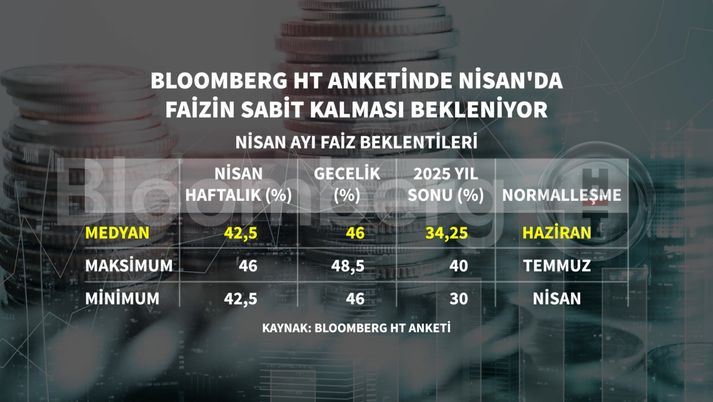 Bloomberg HT anketine katılan ekonomistlerin medyan beklentisi, Para Politikası Kurulu’nun (PPK) yüzde 42,50 seviyesindeki politika faizinde değişikliğe gitmeyeceği yönünde.
