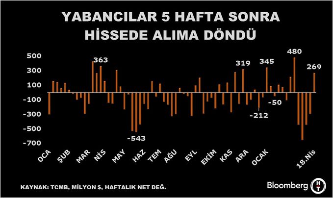 Türkiye Cumhuriyet Merkez Bankası(TCMB) tarafından açıklanan verilere göre, yurt dışında yerleşik kişiler piyasa fiyatı ve kur hareketlerinden arındırılmış verilerle 18 Nisan haftasında 269,1 milyon dolar net hisse alışı yaptı.