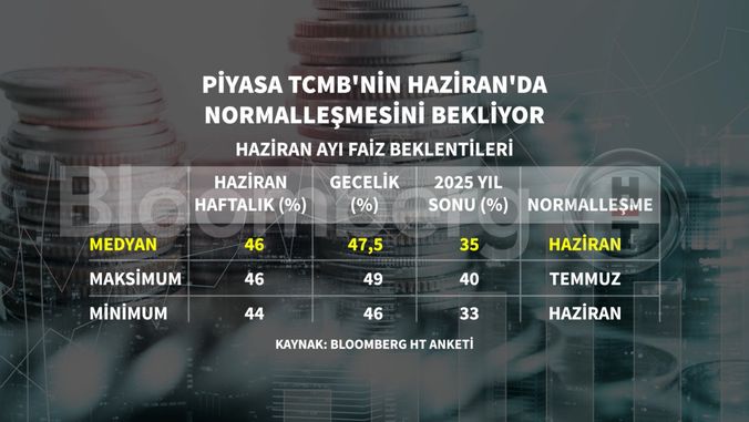 Ankete katılan 22 kurum katılırken Haziran ayında en düşük haftalık repo faizi tahmini yüzde 44 seviyesinde olurken, en yüksek beklenti yüzde 46 oldu.
