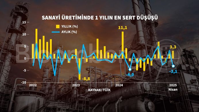 Türkiye’de sanayi üretimi aylık bazda ise yüzde 3,1 azalış gösterdi. Bu son bir yılda görülen en kötü aylık bazlı azalış oldu.