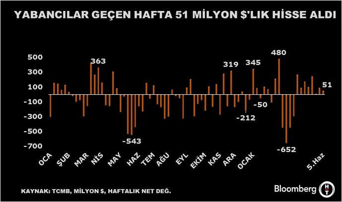 Yurt dışında yerleşik kişiler piyasa fiyatı ve kur hareketlerinden arındırılmış verilerle 6 Haziran haftasında 51,3 milyon dolar net hisse alımı yaptı.