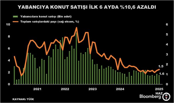 Yabancılara yapılan konut satışları Haziran ayında bir önceki yılın aynı ayına göre yüzde 8,7 oranında artarak bin 565 oldu. Haziran ayında toplam konut satışları içinde yabancılara yapılan konut satışının payı yüzde 1,5 olarak gerçekleşti. Yabancılara yapılan konut satış sayısının en fazla olduğu iller sırasıyla 603 ile Antalya, 521 ile İstanbul ve 128 ile Mersin oldu.