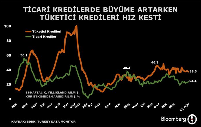 13 haftalık yıllıklandırılmış ve kur etkisinden arındırılmış büyüme ticari kredilerde büyüme 15 Ağustos haftasında önceki haftaya göre 1,6 puan arış gösterek yüzde 24,4 seviyesine çıktı.