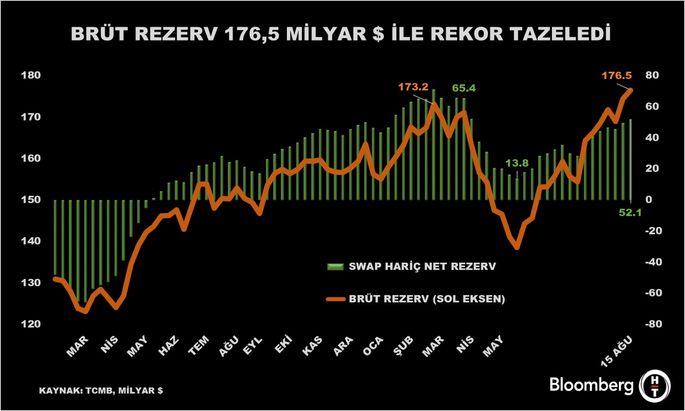 Böylece Merkez Bankasının toplam rezervleri, 15 Ağustos haftasında bir önceki haftaya göre 2 milyar 145 milyon dolar artışla 174 milyar 365 milyon dolardan 176 milyar 510 milyon dolara çıktı ve üst üste ikinci haftada rekor seviyeye ulaştı.